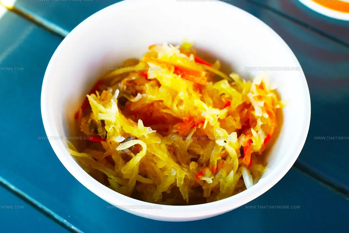 Filipino atchara delivers a zesty punch through pickled green papaya and vibrant companion vegetables that dance with tangy-sweet complexity.