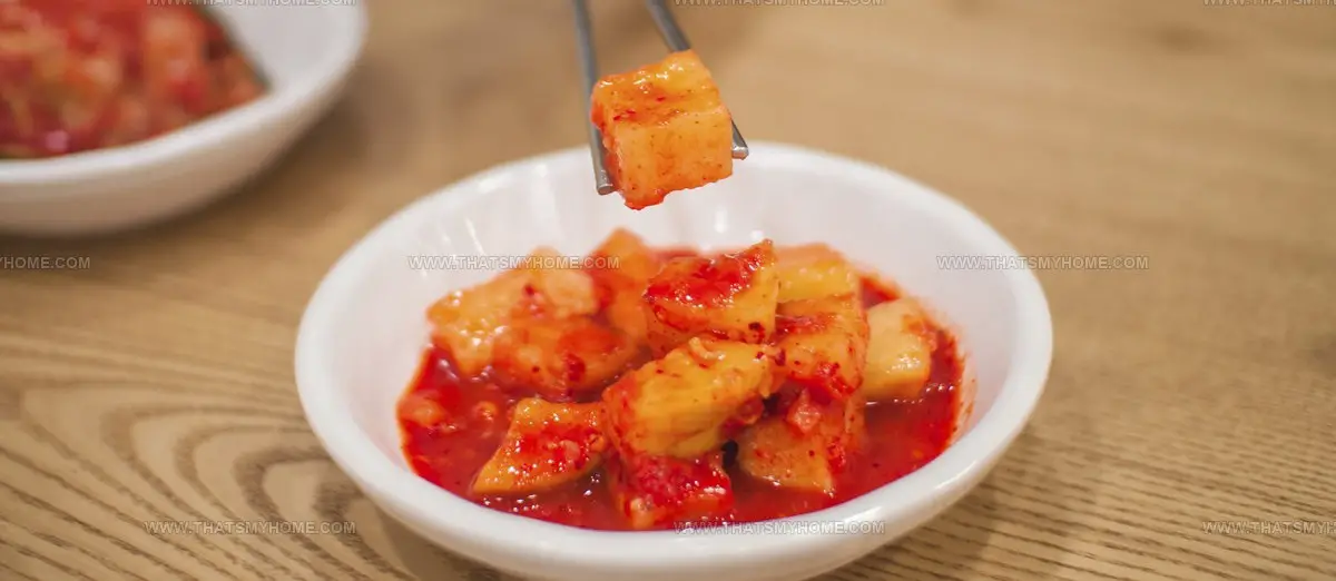 Korean families slice mu (radishes) into precise cubes and coat them with a fiery blend of chili powder, onions, and ginger.