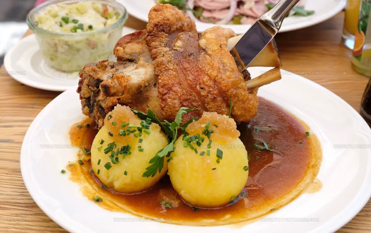 Bavarian kitchens specialize in preparing this iconic dish by slow-roasting whole pork knuckles until the skin becomes perfectly crackling and brown.