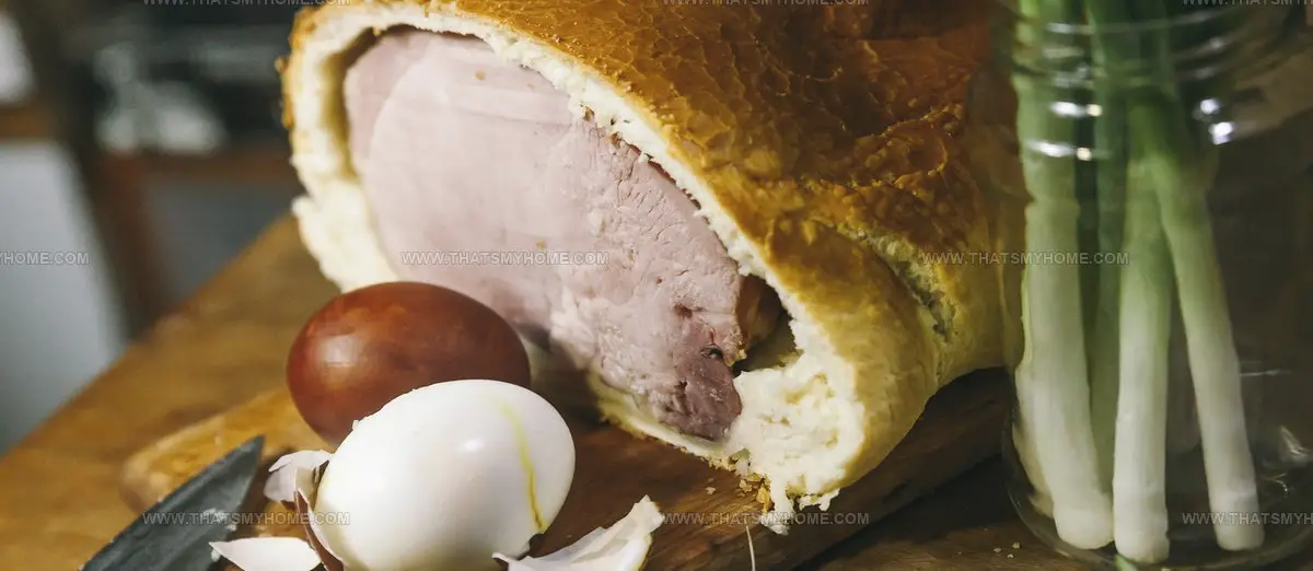 Whole or sliced pre-cooked ham receives a flavorful mustard or honey glaze before being carefully enclosed in delicate puff pastry.