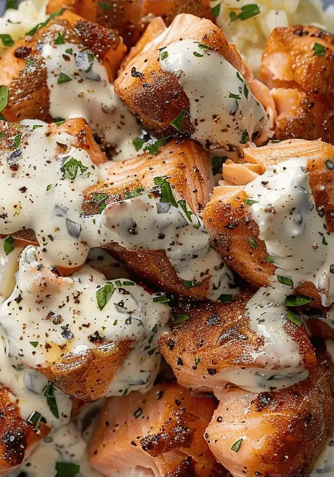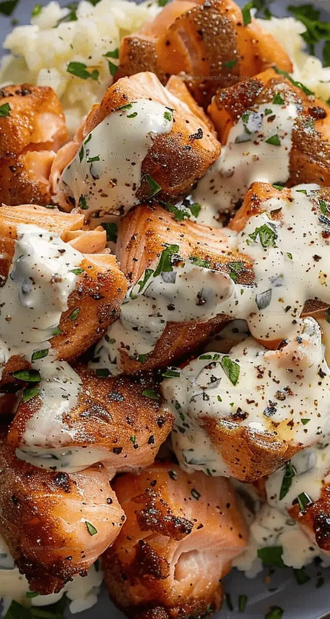 Transfer cooked salmon bites to a serving bowl. Drizzle generously with garlic cream sauce. Serve alongside mashed potatoes or rice for a complete meal.