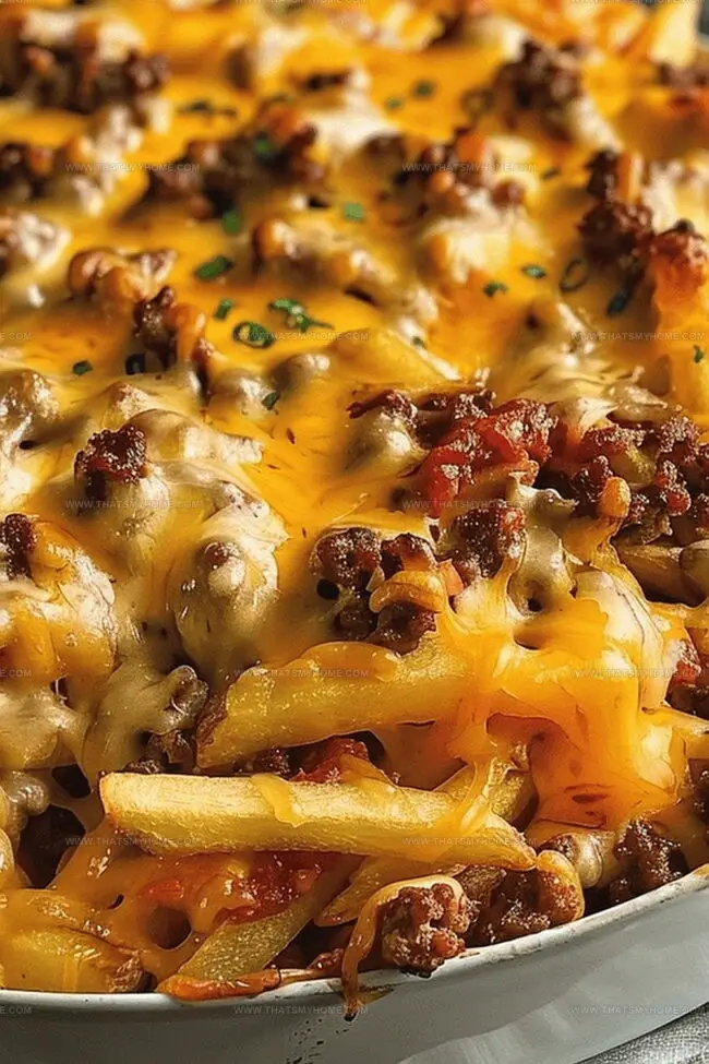 Remove from the oven and let cool for a few minutes. Serve hot with optional toppings such as:Enjoy this ultimate comfort food that combines the best of a cheeseburger and french fries in one delicious dish!