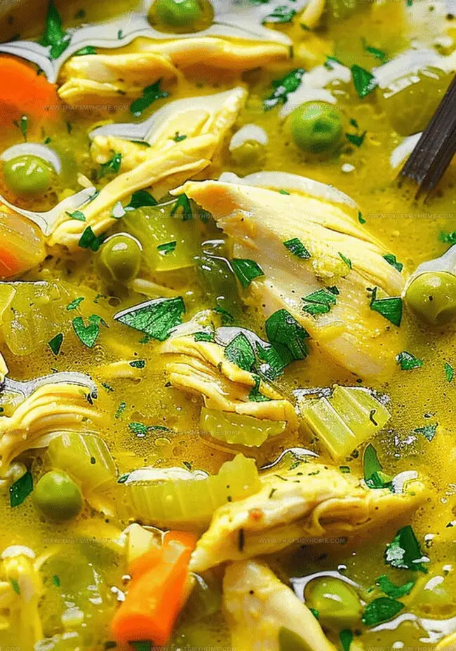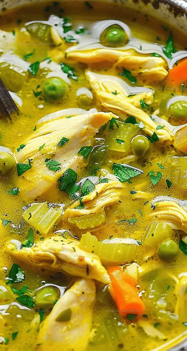 - Return the shredded chicken to the pot, introducing sweet green peas and freshly chopped parsley. Allow the soup to simmer for an additional 3-4 minutes, melding the ingredients together.