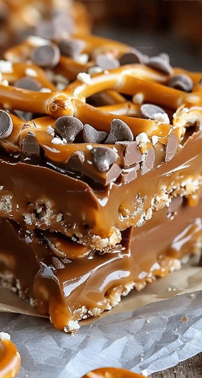 Crushed pretzels create a crunchy base that perfectly complements rich, gooey caramel layers.