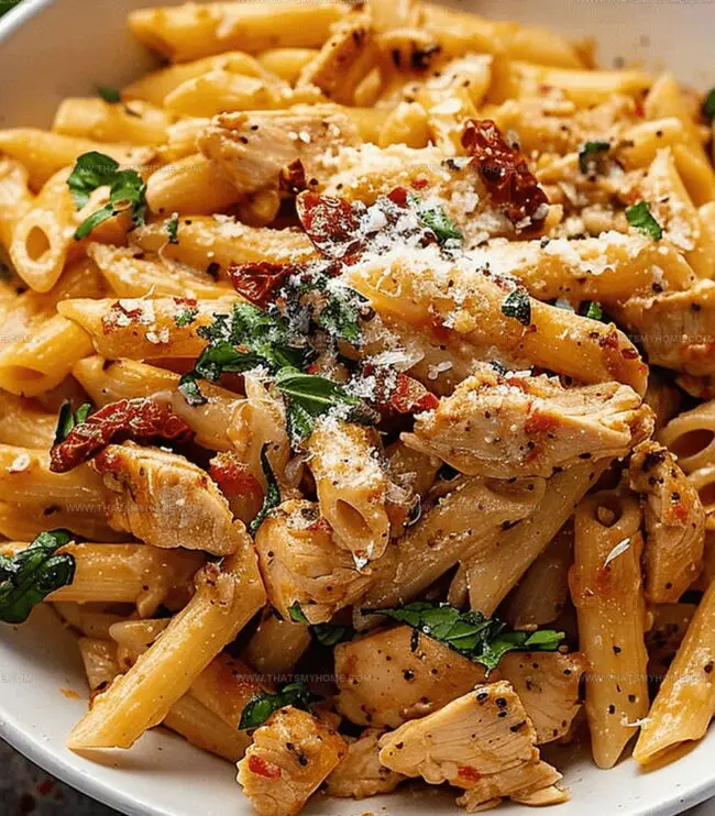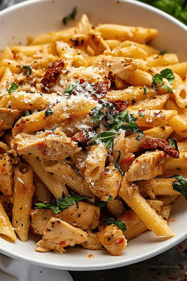 - Plating: Slice chicken into elegant diagonal strips. Arrange pasta on serving plates, layer chicken strips, and generously drench with creamy sun-dried tomato sauce.