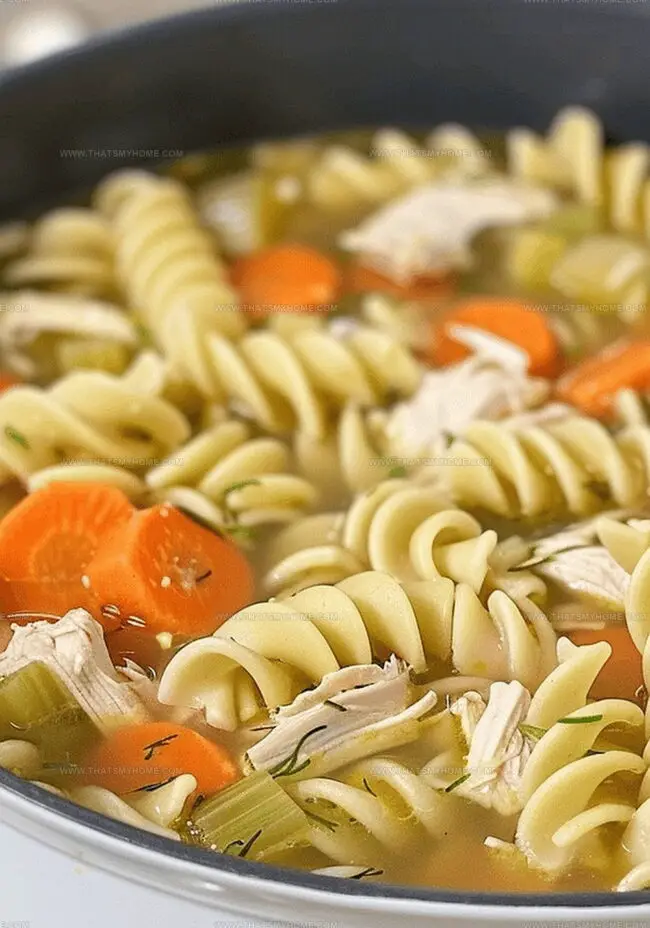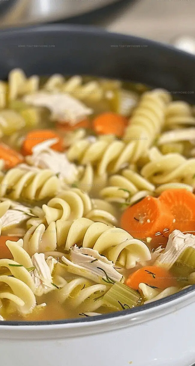 Resting Phase: Remove pot from heat, allowing ingredients to harmonize and flavors to intensify for 5 minutes before serving the aromatic Chicken Noodle Delight.