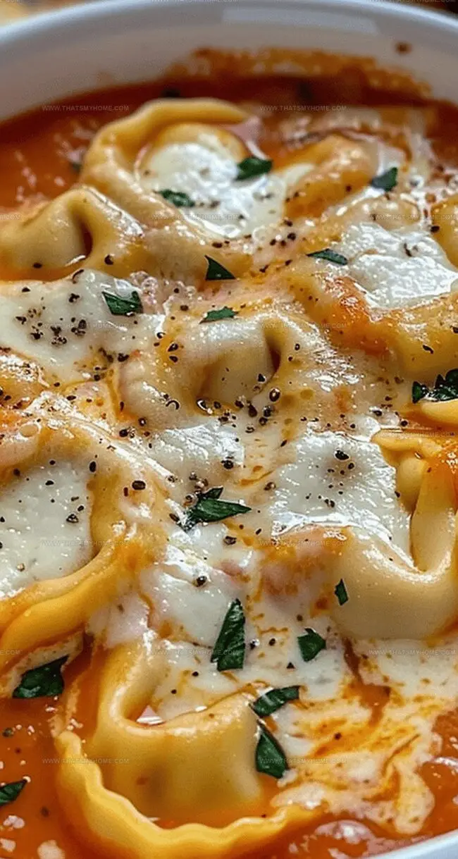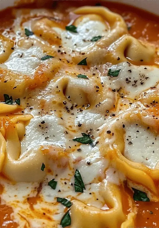 Packed with tender cheese-filled pasta and robust tomato flavors, the soup delivers a delightful culinary experience.