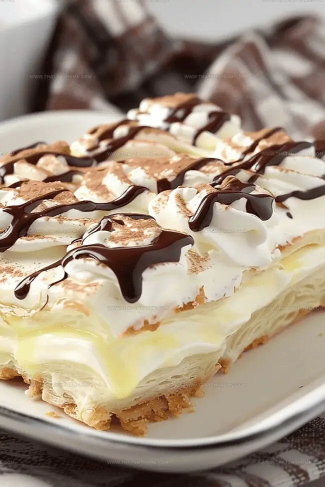 - Assembly: Spread the cream cheese mixture evenly over the cooled pastry base, then top with whipped topping and artistically drizzle chocolate syrup.