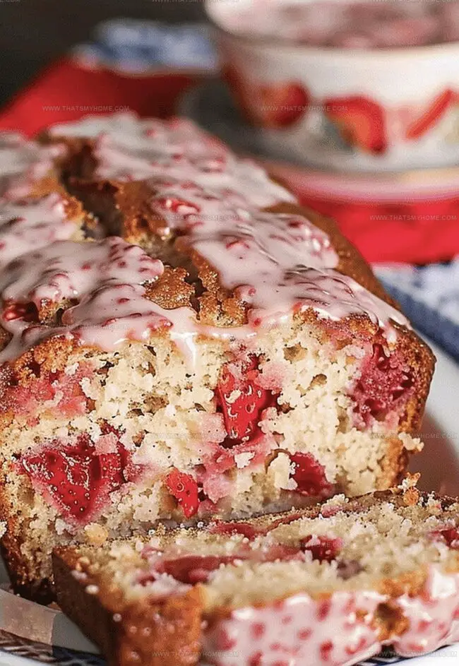Allow the bread to rest and cool completely, then top with a luscious strawberry glaze that adds a final touch of sweetness.