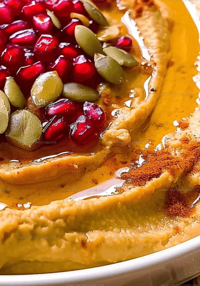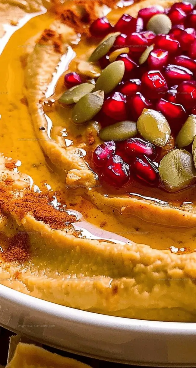 - Pomegranate arils and candied pumpkin seeds create a beautiful contrast of sweet, crunchy elements against the creamy hummus base.