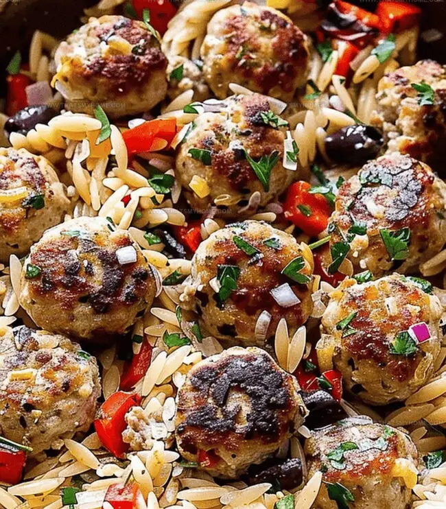 Tender, herb-infused meatballs nestle perfectly among golden orzo, creating a Mediterranean-inspired feast in one pan.