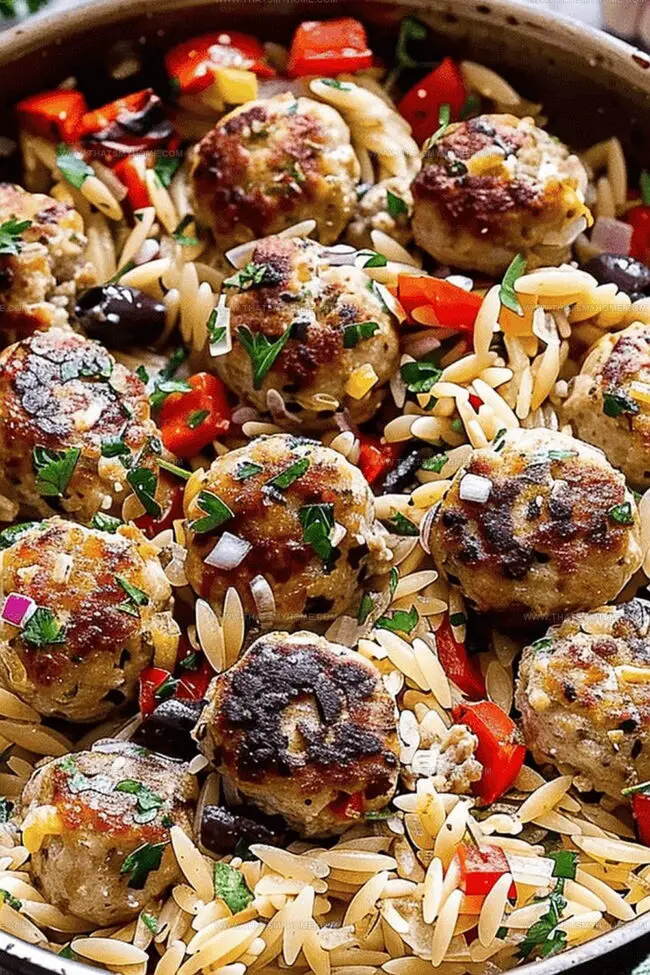 Introduce briny kalamata olives and fresh herb medley to the orzo, creating layers of flavor. Nestle the golden meatballs atop the creamy pasta, then crown with crumbled feta cheese and a sprinkle of additional herbs for a burst of freshness.