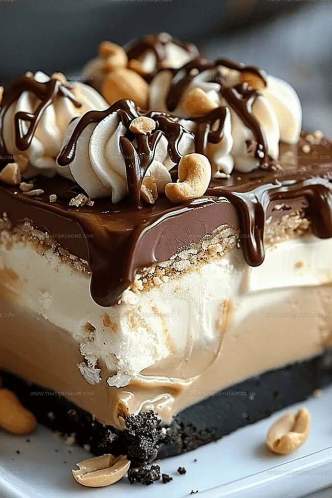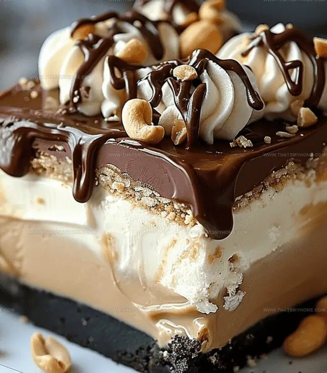 - Serving Presentation: Remove from dish using parchment paper overhang, slice into precise squares, and garnish with additional whipped topping and whole peanuts for enhanced texture and visual appeal.