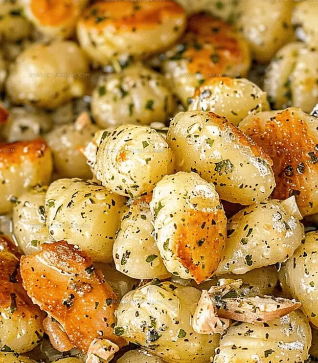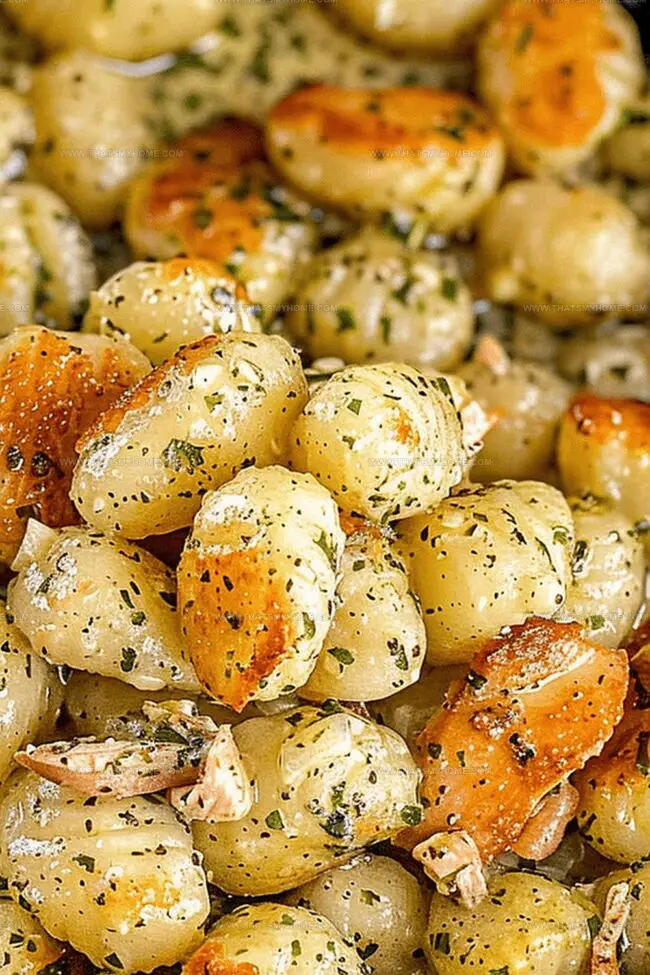 Tender chicken pieces nestle perfectly among pillowy gnocchi, creating a harmonious blend of textures and flavors.