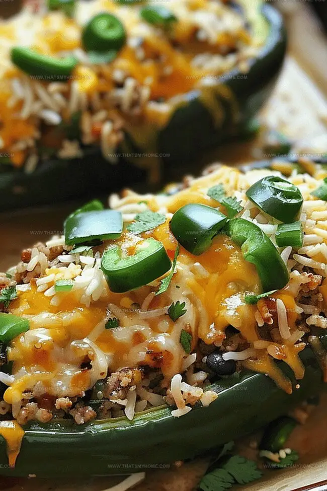 Fold creamy cheese and fresh cilantro into the mixture, stirring gently. Generously fill each pepper boat, crowning them with an extra sprinkle of melty cheese that promises a golden, bubbling top.