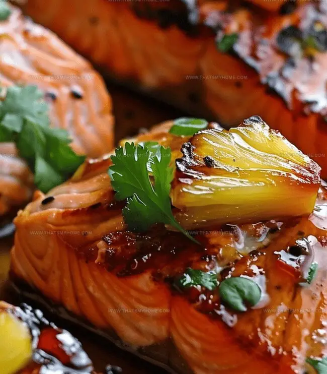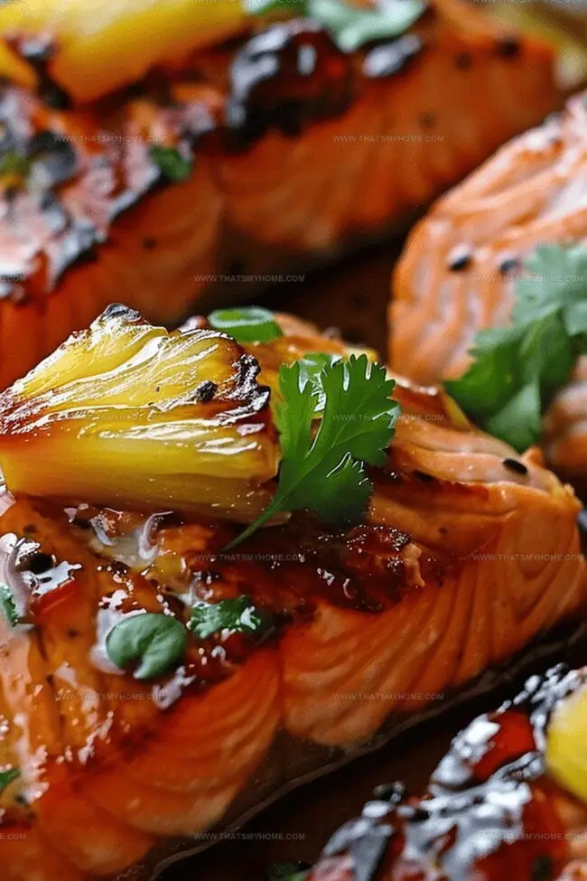 Finishing Touch: Remove salmon from the oven when cooked through, garnish with fresh pineapple slices and chopped cilantro, then serve immediately to preserve the dish’s optimal temperature and moisture.