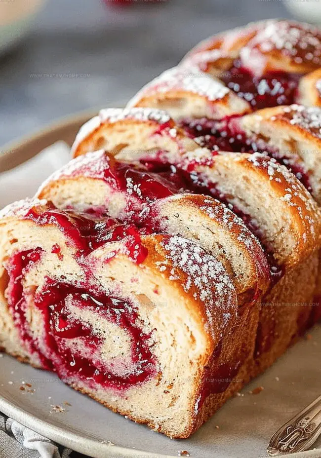 Golden-brown braids of soft dough weave through pockets of luscious fruit preserves, creating a stunning visual and flavor experience.