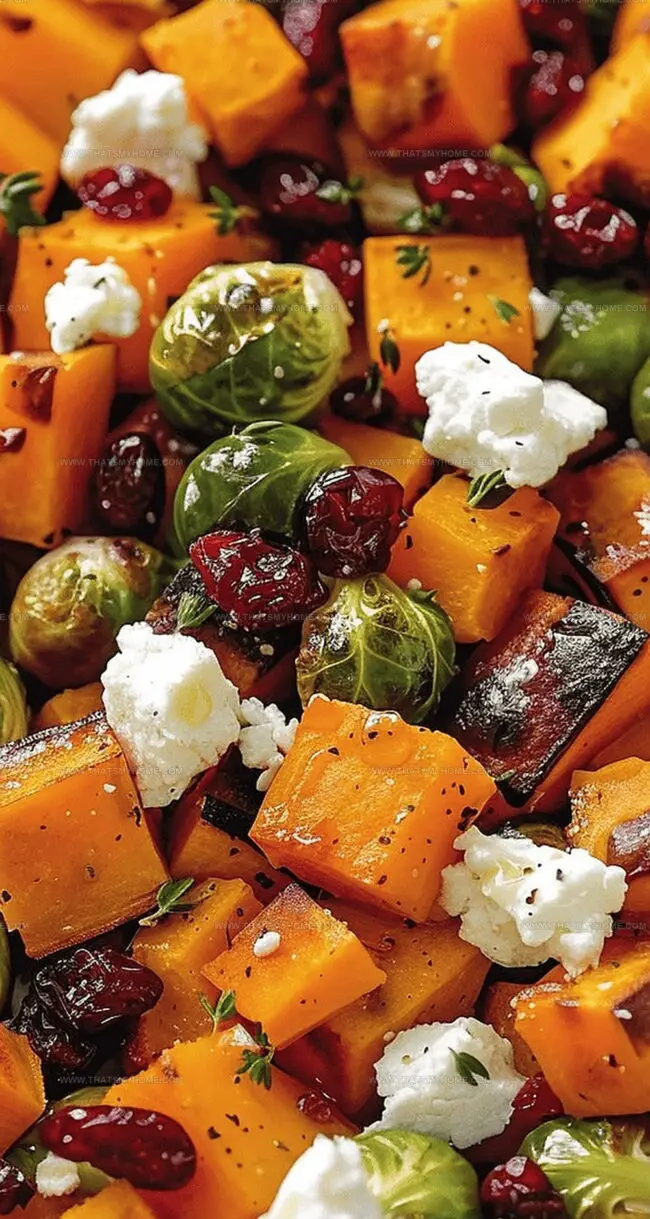 Final Symphony Carefully transfer golden-edged roasted vegetables to a beautiful serving dish. Cascade the crimson cranberry glaze across the medley, creating elegant swirls. Sprinkle crumbled goat cheese like delicate snowflakes, adding a creamy contrast that elevates the entire composition.